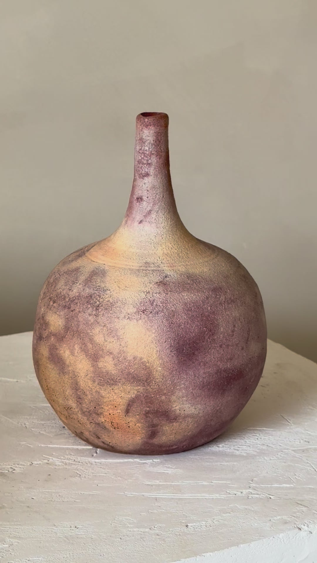 The Saggar Ceramic Vase is a striking, one-of-a-kind decorative piece created through a meticulous handcrafting and firing process. This vase features stunning hues of pink, apricot, and deep purple — the result of saggar firing with Ferric Chloride, a process that ensures each vase is unique. Perfect as a unique artisan gift, standalone art object or a distinctive accent in a curated space.